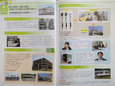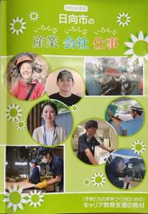 日向市では、中学2年生の全員に『日向市のいろんな産業、いろんな会社、いろんな仕事』という教材を毎年配布しています。また小学校には3冊ずつお配りしています。これは、掲載各事業所様のご協力のもとに藤屋印刷様が作成していただき、中学校を中心に配布しているという画期的な教材になります。