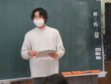 3人目は、日知屋東幼稚園教諭の髙舘隼仁様の教室を見学しました。この仕事をされるきっかけは、ご自身が保育園児の頃に男の先生がいて、その先生ならではの男の子に対する遊び方が気に入っていて、自分も将来そういう存在になりたいと子どもながらに思っていたそうですから、キャリア形成は相当早かったことが伺えました。仕事を通じて、同僚の先生たちや保護者の皆さんに話をする機会が多くなり、自分の自信にもつながっているとのことでした。また、保育士と幼稚園教諭の両方の資格をもっていることが進路選択では有効だという資格取得の効果についても話していただきました。日常の仕事の対象は小さな子どもたちなので、園内のあらゆる施設や道具については、子ども目線で細かいところまで観察しないと怪我につながるため、そういう点検は大変だというお話もありました。細島小の児童へは、自分から手を挙げ、話を聞くなど毎日続ける「継続する力」の重要性をメッセージとして送られました。