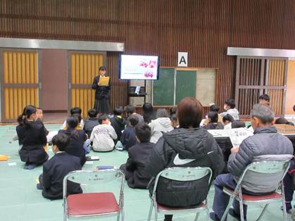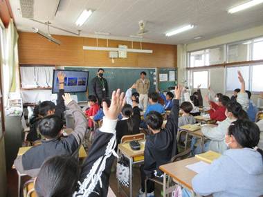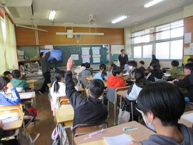 昨日、細島小学校の5・6年生を対象によのなか教室が行われました。5・6年生31名が3つのグループに分かれて3名の講師の先生から話を聞く学習を見学しました。