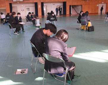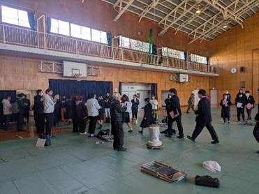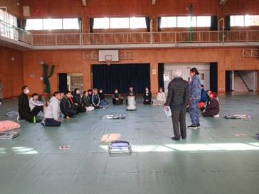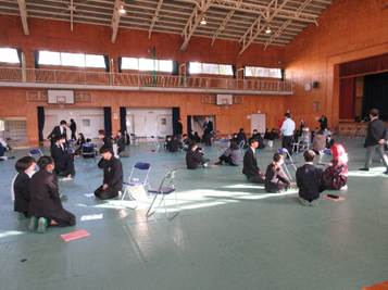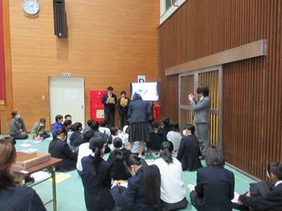 生徒は予め、3名ずつのグループ20班に分かれ、ストーブを数か所に入れた体育館にグループで別れて着座します。そこへ、20名の講師の先生(大人)が分かれて入り、自己紹介と自分の人生グラフの説明を行います。その後、各グループの1名は残り、班の講師の先生と1対1で、今度は予め作ってきた自分の14年間の人生グラフを講師の方に語り始めます。同時に、各班2名のほかの生徒は3か所に分かれて、人生紙芝居を読んでくださる方の場所に行き、その方の生き様を紙芝居で聞きます。これが1ラウンドになります。