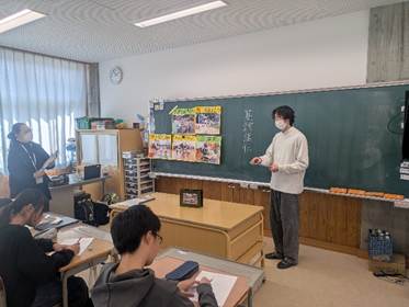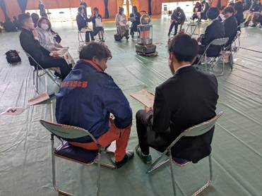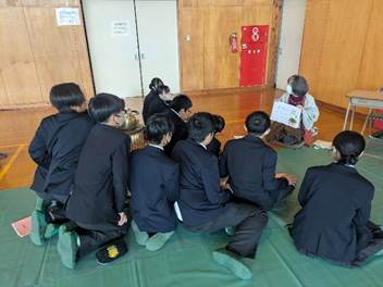 紙芝居は、その方のこれまでの人生を物語ったお話になります。「当時はペペロンチーノにはまって栄養失調になってしまいました。」と赤裸々に話されると、生徒が大きくうなずくという場面がありました。また、「国体で3位、バンタム級で3位となり、周りから『ブロンズコレクターやね』と冷やかされました。」と言われると、大きな笑いが起こるグループもありました。さらに、「大人になると注意してくれる人は減ります。だからこそ今、注意してくれる人がいるうちにちゃんと話を聞いた方が良い。」と、今の中学生へのメッセージも随所に織り交ぜながらの紙芝居でした。