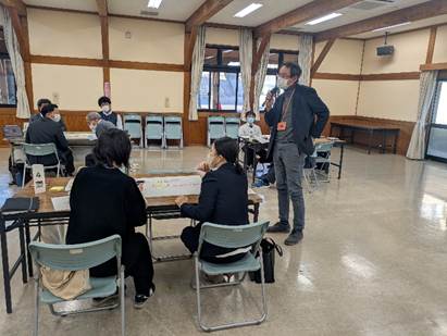 次に、意見交換の場では各地区から様々な活動が報告されました。「参観の日の懇談時に低学年生の見守りを行っている」「授業補助の必要性から機転を利かして地域との調整をしている」「小中学校のクラスで読み聞かせをしている」「祭りの舞を長年指導している」「ミシン補助をしている」「学有林の活用を掘り起こしからしている」「面接指導に協力している」「よのなか挑戦ではコロナ禍で途絶えていた事業所が喜んで迎えてもらった」など、調整に奔走しておられる様子が見えてきました。