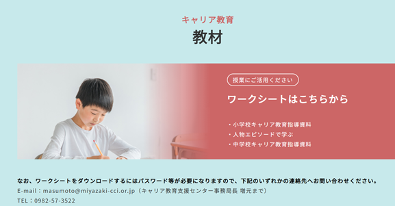 本日はキャリア教育支援センターのホームページについてコマーシャルします。いつもブログをご覧いただいている方々には馴染みのあるページですが、学校関係者で実際に授業を構想する場合に教材を検討する先生方にぜひ使用していただきたいコーナーがあります。