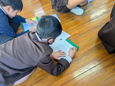 今回もMFE HIMUKAの黒木猛様の「エピソードシート」(仕事人物語)を活用しました。しかし、対象が5年生なので、シートの内容は5年生用に編集し直したものを使用しました。それでも「仕事上の苦労」や「やりがい」、そして、仕事の「社会的役割」については同様に読み取ってもらいました。5年1組、2組どちらも苦労しながらも鍵となる部分に線を引きながら熱心に読み進めていました。