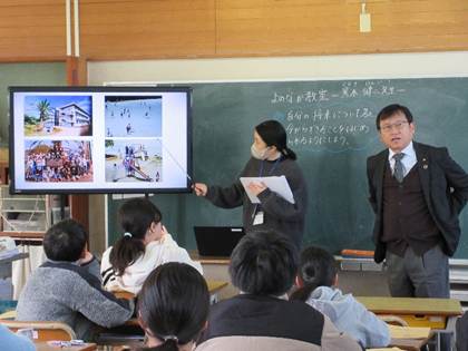 研修会では、まず大王谷学園飯干校長先生より、小中一貫教育におけるキャリア教育についての説明がなされました。当時は、学校の荒れ、社会へはばたく生徒、土台作りの教育、学校外の人材の活用、学ぶ機会の拡充という多くの課題を抱えた中で、「よのなか挑戦」「よのなか教室」を中心活動としたキャリア教育への取組がスタートしたという説明でした。具体的に初等部、中等部でのそれぞれの活動をプレゼンテーションで分かり易く説明していただきましたので、初めて日向市に来られた方々も理解できたのではないかと思いました。
