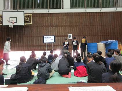 Bグループでの発表は、コープみやざき様で体験した発表を行っていました。ここでは3人が交代で発表をしていましたが、3人とも声が大きくはっきりと伝えるようにしていました。畜産部、水産部、フロア、レジと、様々な部門で体験活動をさせていただいたようです。特にお客さん相手の仕事ではコミュニケーションが最も重要視されることを学んだようで、「先取りあいさつ」ということを強調していました。