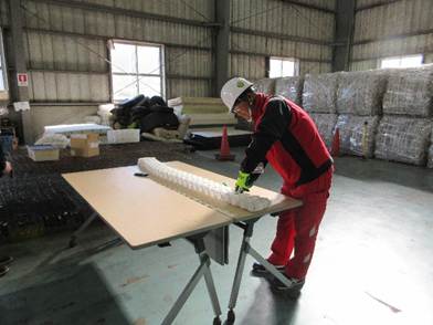 続いて、実際の加工作業場へ案内していただき、ここでベッドのマットレスを100%リサイクルする工程の説明を現物で確認しながら教えていただきました。マットレスのスプリングには2種類あり、スプリングが全体の金具と一体型になっているものは取り外しが楽だが、スプリングが一つ一つ独立してカバーに包んであるものが300個から400個並んでマットレスの中に収めてあるものは大変手間がかかるということが説明でよく分かりました。カバーを剥がしカッターやはさみで切り取る人、見えてきた1個のスプリングを中から取り出す人。この連動した作業の繰り返しで一つのマットレスを分解していくそうです。カバーは可燃性残さとして固形燃料になり、スプリングは再加工してとして生まれ変わるのだそうです。この工程では埋め立てに回るゴミは何一つなくすべて再利用されるというところが、この会社の大きな社会的意義につながるのだと感じました。