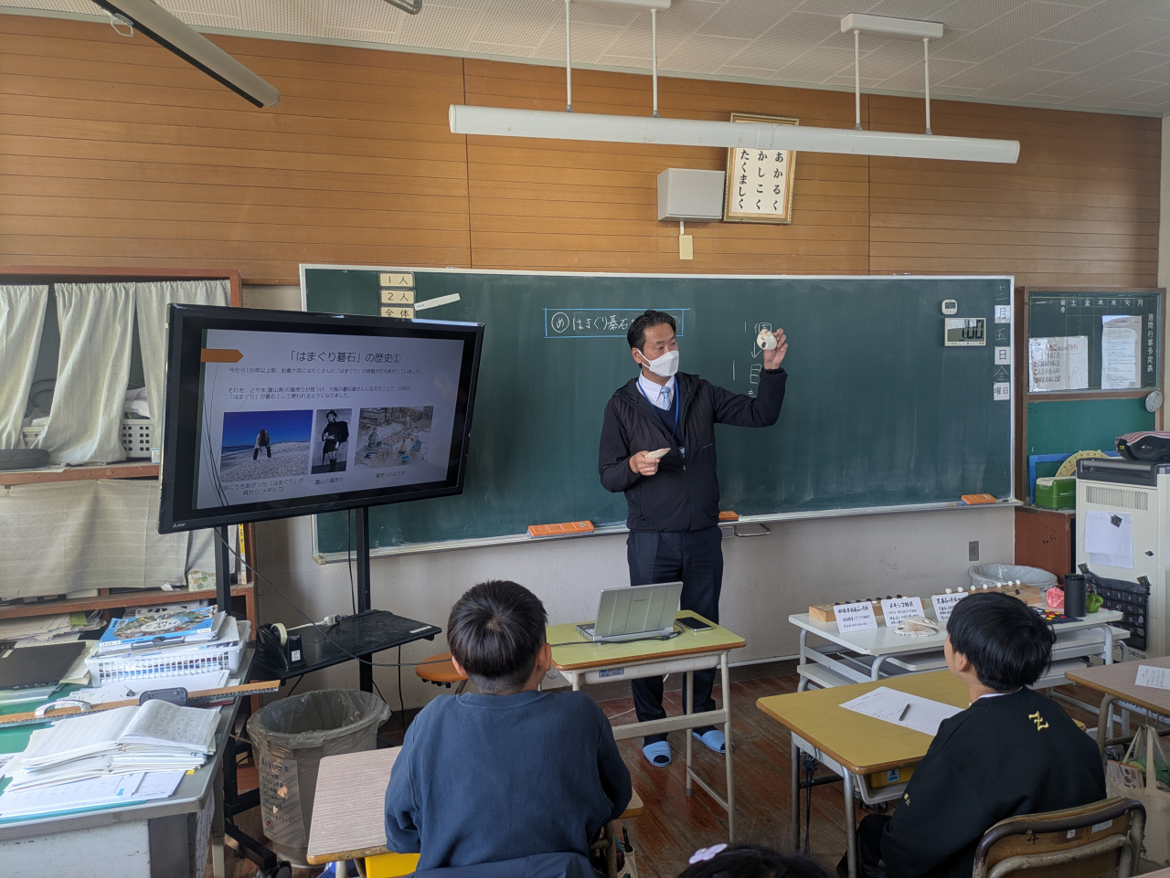 「地域の特色ある産業を学び、日向市の魅力を知ること」をテーマに、市内で「はまぐり碁石」を製造しているミツイシ(株)の黒木宏二さんを講師にお迎えし、日向市のはまぐり碁石の歴史や、碁石ができるまでの工程などについてお話しいただきました。