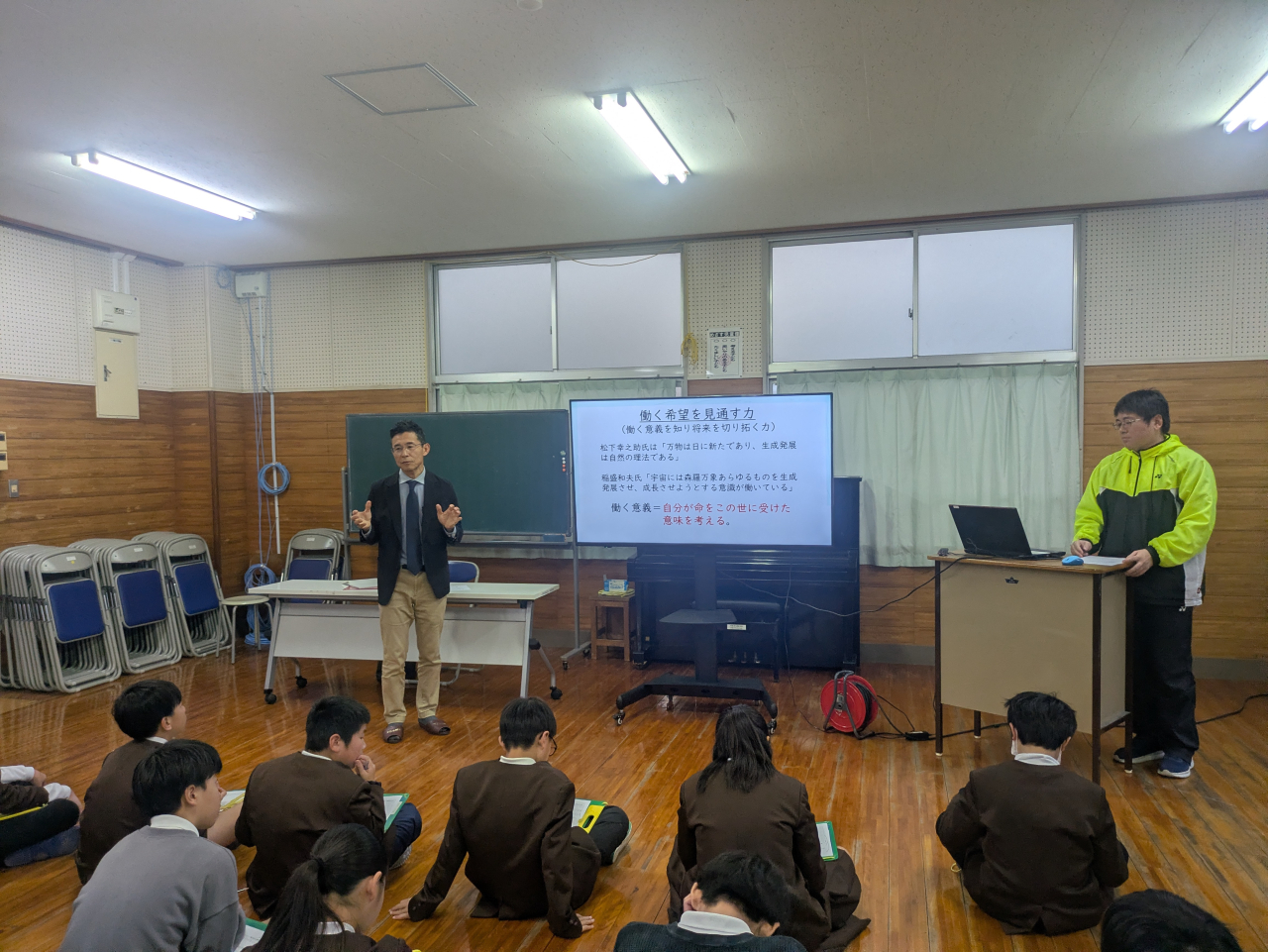 今回の「よのなか先生」は、建設業に加え、日向市特産の柑橘類「へべす」の生産や農業用の「土」の製造にも取り組む株式会社内山建設の内山雅仁さんをお招きし、お話をしていただきました。 生徒の皆さんは積極的に質問をし、ワークシートにも一生懸命取り組んでいる様子が見られました。